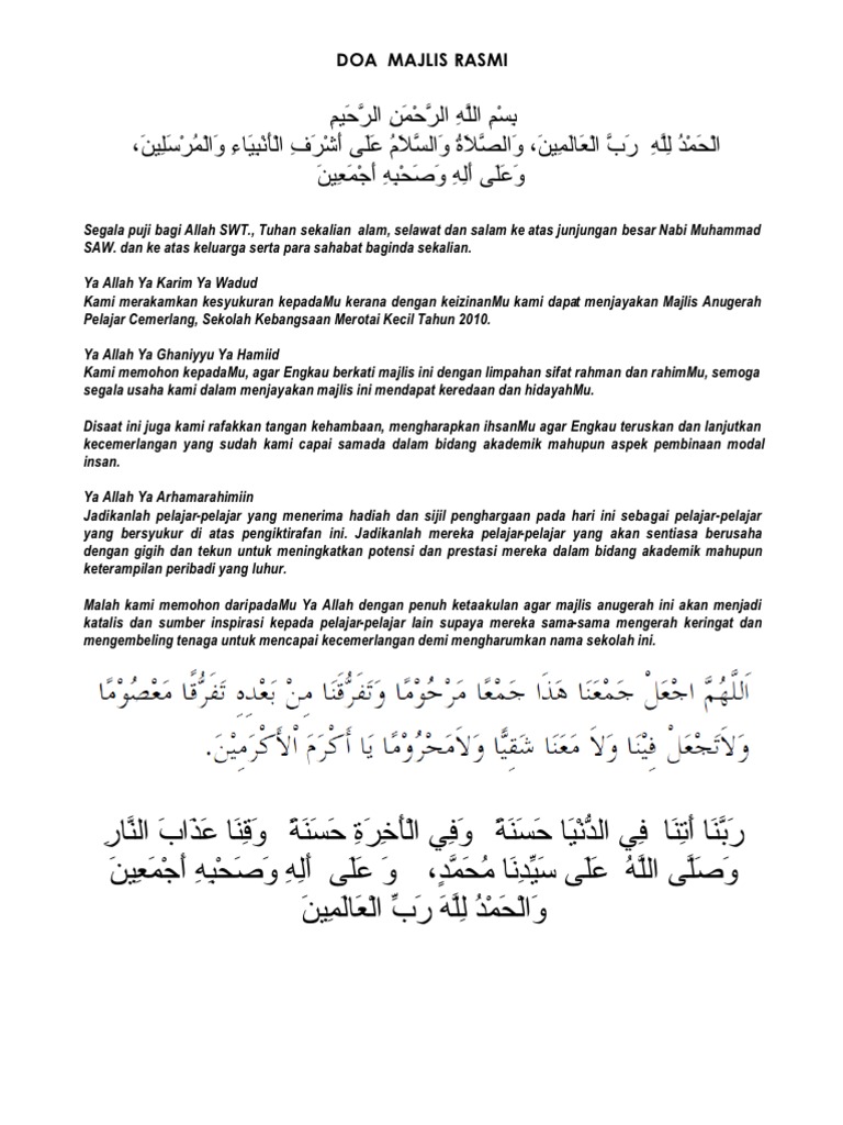 Sebagai contoh, susunan acara untuk majelis taklim, keagamaan, atau acara resmi, dapat digunakan susunan berikut: Doa penutup majelis keutamaan adab dan terjemahannya. Download as doc, pdf, txt or read online from scribd. Khutbatul hajah adalah doa yang mana rasulullah. Panduan buat umat islam di malaysia terutamanya yang sering bertugas sebagai pembaca doa samada di majlis rasmi atau tidak rasmi.